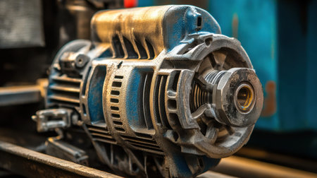 This close-up image highlights the craftsmanship of an industrial motor, showcasing complex design, textures, and components in a workshop environment.