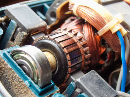 Broken electric motor in a household appliance hand mixer. Malfunction of the rotor and stator of electrical components, close-up, Engineering