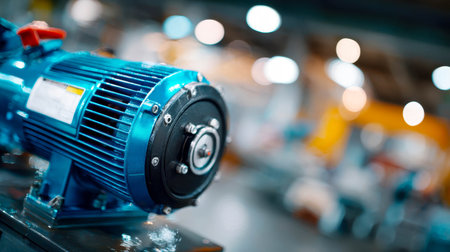 Close-up of a blue industrial electric motor in factory environment, symbolizing engineering, energy, and machinery.
