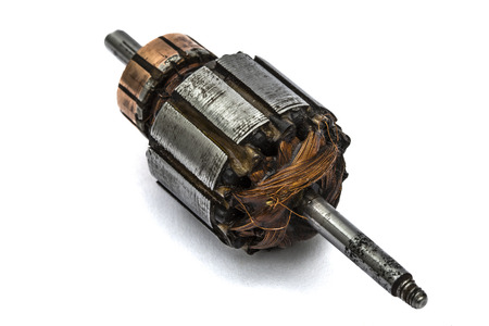 Rotor of a small electric motor. Electric accessories for repairing power tools. Dark background.