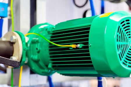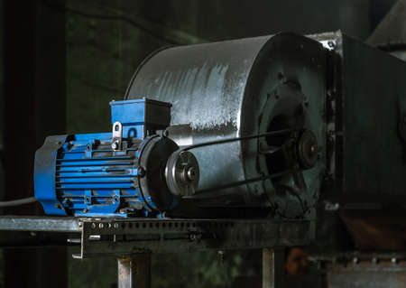 Blue industrial electric motor. Agricultural electric motor on a gray metal box. Concept - sale of industrial motors. Agricultural equipment. Electric motor for air conditioning or heating system.