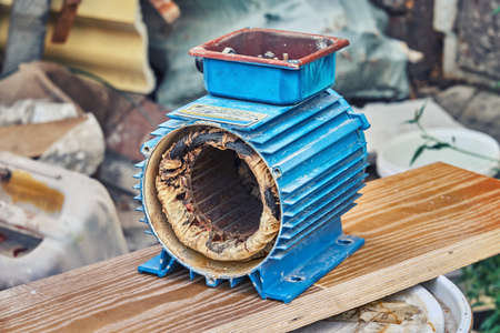 Burnt out electric engine with light blue metal case stands on long wooden board on waste products background close view