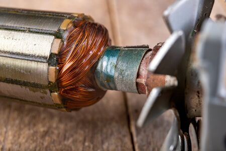 Electric rotors of an electric motor on a workbench. Spare parts for angle grinders. Dark background.