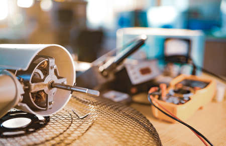 Close-up of an iron motor from home cooling fan and testind tools lies on a table in workshop. The concept of repair and restoration of damaged equipment