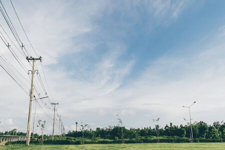 Electricity pole against blue sky clouds, Transmission line of electricity to rural distribution