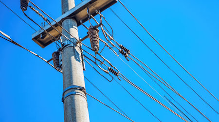 Close-up of a high-voltage power pole with insulators and cables, clear blue sky background