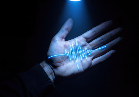 A digital representation of heart rate is displayed with a glowing pulse line fluctuating in a rhythmic pattern against a dark background, conveying a sense of life and vitality.