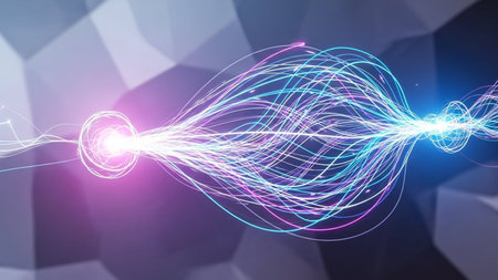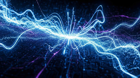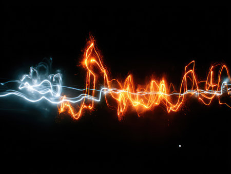 This abstract image captures electric currents creating glowing lines against a dark background, showcasing vibrant reflections and dynamic energy patterns.