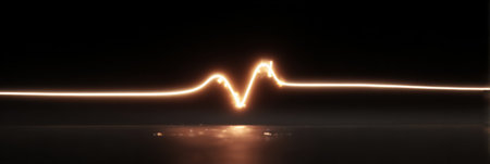 A vivid pulse line glows in warm orange tones, reflecting off a smooth surface, illustrating energy and rhythm in a dark setting.