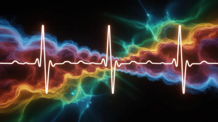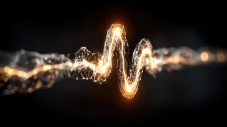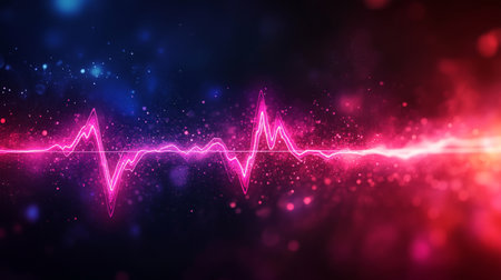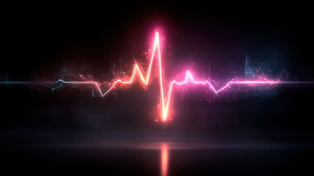 This abstract illustration features a glowing waveform on a dark background. It symbolizes health, technology, and energy, perfect for digital projects.