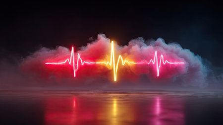 A neon graphic of a heartbeat pulse illuminates against a backdrop of vapor. The image features vibrant colors, predominantly red, yellow and orange, contrasted against a dark background, with a reflective surface adding depth. Suitable for various design projects and visual representations related to health or science.