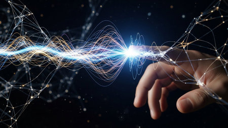 A human hand reaching out to touch a glowing network of light energy and data connections in darkness.