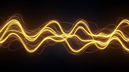 Abstract neon blue and yellow waveforms pulsate dynamically against a deep black background, suggesting data or sound.