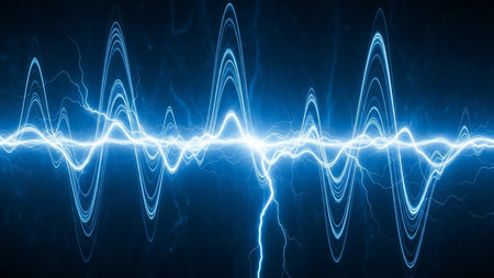 An abstract blue waveform with bright, energetic lightning strikes pulses across a dark background, representing electricity and energy.