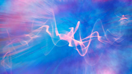 Blue, red, white and purple light painting photography, long exposure, ripples and waves against a black background. Curves and waves of neon green light against a black background.
