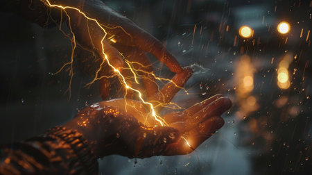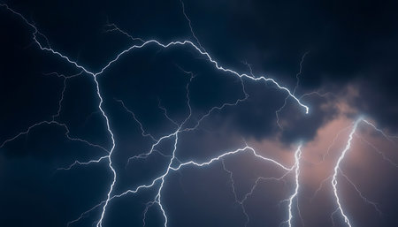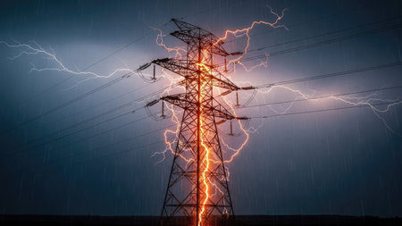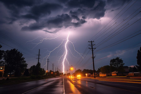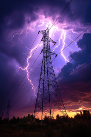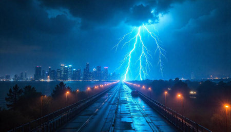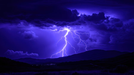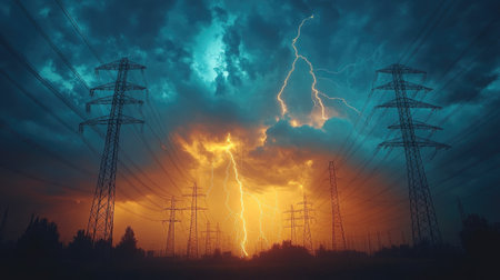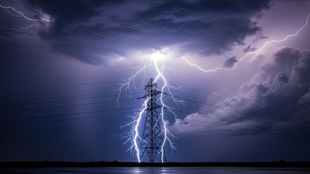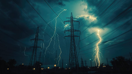 A striking nighttime image captures a powerful lightning strike illuminating power lines. The scene presents dark blue and gray hues, with dramatic streaks of bright light. The composition features an overhead view with a focus on natural elements. This image is suitable for use in educational materials or commercial design projects.