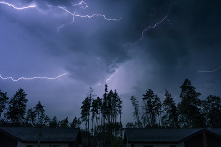 Dramatic night sky with bright lightning during a thunderstorm. Thunderstorm in the suburbs, forest and houses.