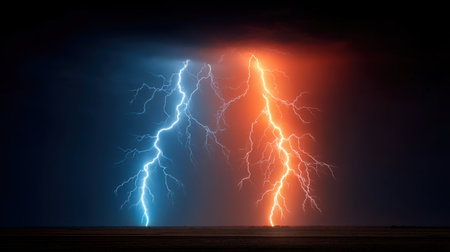 A breathtaking display of nature featuring blue and orange lightning bolts striking against a dark sky, creating a dramatic and vibrant contrast that captivates viewers.