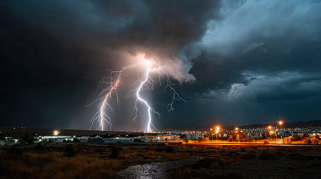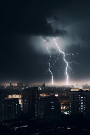 Thunderstorm over a cityscape at night with dramatic lightning vibrant clouds and illuminated buildings create a striking contrast against the stormy sky