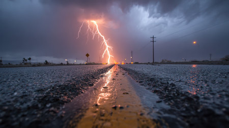 Dramatic Lightning Strike Illuminates Stormy Road at Dusk in Rural Area with Dark Clouds and Rainfall Creating a Powerful Atmosphere