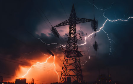 An imposing power tower stands amidst a dramatic scene as lightning strikes. The image showcases electric arcs against a dark sky. The composition highlights the structure's framework. This imagery could be employed for editorial articles or as part of a technological or environmental theme.