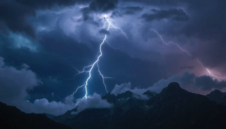 A powerful lightning storm unfolds across the mountain range, with vivid flashes illuminating dense clouds. The atmospheric spectacle captivates viewers on a stormy night.