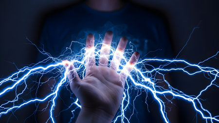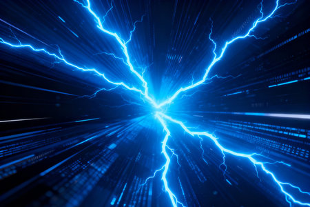 A dynamic digital illustration of intense electric blue energy radiating from a central point, resembling an electrifying explosion or a powerful electrical discharge. AI Generation
