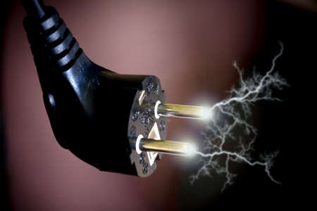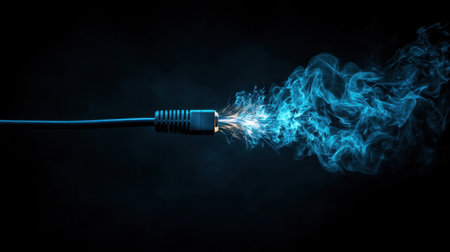 A striking image of an electrifying spark emanating from a cable, surrounded by blue smoke, set against a dark background, symbolizing energy and innovation.