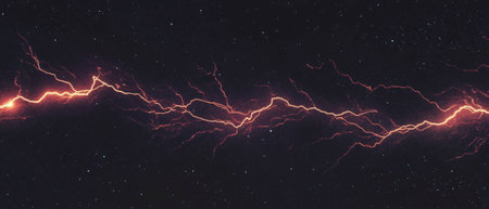 This mesmerizing cosmic image showcases vibrant electric blue and orange lightning streams cutting through a dark starry background, creating a captivating visual experience.