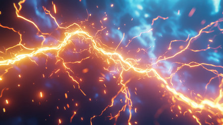 This captivating image showcases a dynamic surge of electric energy, featuring vibrant blue and orange lightning strikes against an abstract digital background.