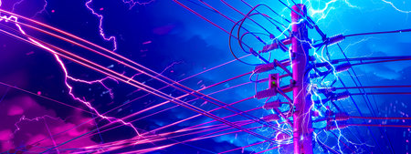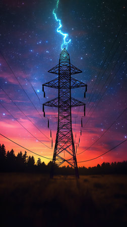 A striking nighttime image captures a powerful lightning strike illuminating power lines. The scene presents dark blue and gray hues, with dramatic streaks of bright light. The composition features an overhead view with a focus on natural elements. This image is suitable for use in educational materials or commercial design projects.