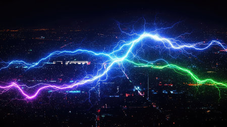 Electric bolts of blue, purple, and green light streak across a darkened cityscape. The image showcases dynamic energy, with bright, multi-colored lines cutting through the night. The composition appears stylized with a digital illustration feel. It could be used for various projects emphasizing power, technology, or weather.