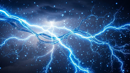 A dramatic depiction of multiple bright blue lightning bolts forking across a dark, cloudy sky. Small, glowing blue particles are scattered throughout the scene, adding to the electric atmosphere. The contrast between the intense light of the lightning and the dark, stormy background creates a powerful and dynamic visual.
