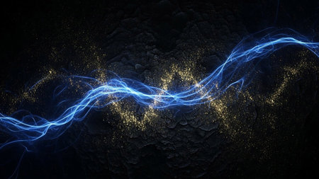 An abstract representation of a powerful blue lightning strike illuminates a dark, textured background. The electric bolt is rendered with fluid, glowing lines, suggesting intense energy and motion. Interspersed with the lightning are numerous small, golden sparks and particles, adding a sense of dynamism and magic to the scene. The dark, rough texture of the background provides a stark contrast to the luminous blue and gold making the energy discharge appear even more vibrant and impactful....