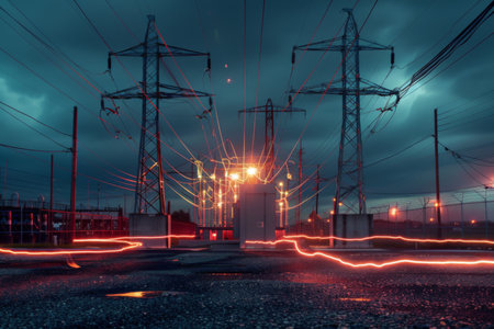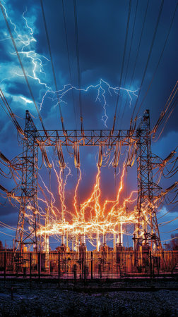 Powerful lightning strikes illuminate an electrical substation during a stormy evening