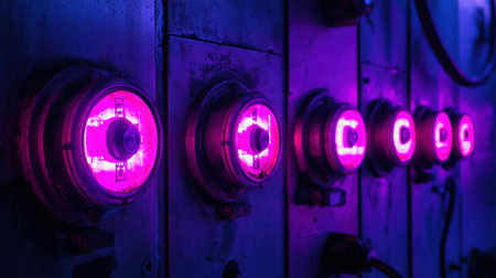 This captivating image features a vintage control panel with glowing neon lights in purple hues, creating a striking industrial atmosphere. The vibrant illumination draws attention to the unique design, making it perfect for creative projects.