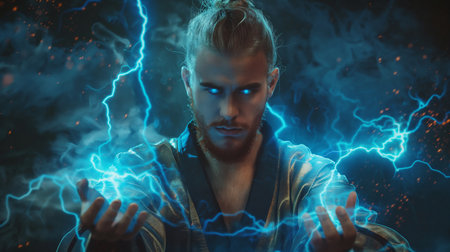A striking and dynamic blue lightning fist design featuring an energetic electric energy effect