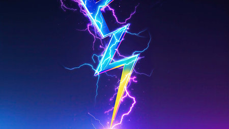 A vibrant lightning bolt bursts through the dark background, glowing with neon colors like blue, pink, and yellow. The illustration captures the intense energy and dynamic movement of electricity.