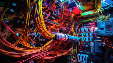 A captivating flatlay of vintage electronic equipment featuring light bulbs, wires, and connectors, showcasing a unique blend of retro technology and creativity.