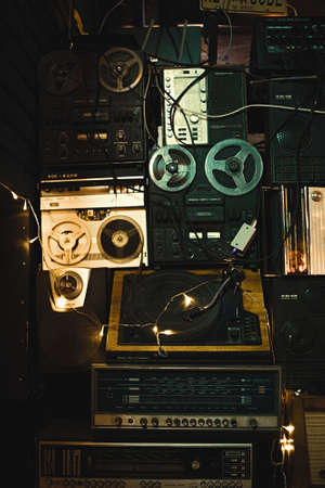 Retro old design boombox radio cassette tape recorders and audio old music player ussr. Vintage style photo background. Vertical.