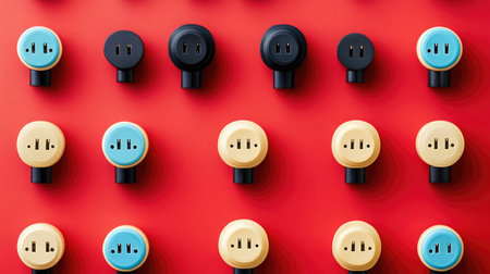 A visually striking composition featuring a variety of colorful electrical sockets set against a bright red background, showcasing design creativity and modern functionality.