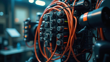 Mix of cables and wires coiling from power sources to robot's frame organized chaos, Professional stock photo, AI generated photograph