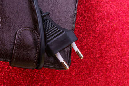 An electrical wire tied into a knot on an old decrepit wallet. The concept of the energy crisis and electricity inflation. Rising electricity prices. Copy space. Close-up element.
