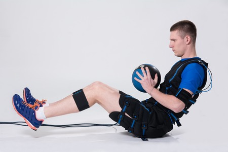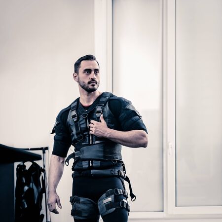 Muscular male athlete in EMS suit with contactor in hand that uses electrical impulses to stimulate muscles on white background. Sport training in electrical muscle stimulation suit
