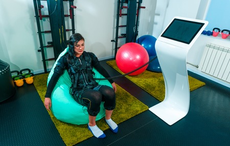 Girl in EMS suit in gym. Sport training in electrical muscle stimulation suit. Making physical exercises.