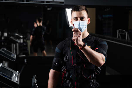 Girl in EMS suit and medical mask in gym. Protection from coronavirus covid-19. Sport training in electrical muscle stimulation suit at quarantine period