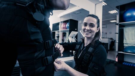 Fitness instructor is putting on an ems suit for athletic model.