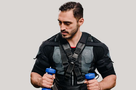 Sporty man in electrical muscular stimulation suit doing exercise with dumbbells