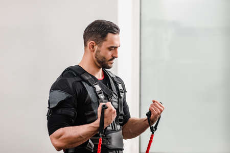 Portrait of young athletic man in EMS fitness vest doing exercises with expander