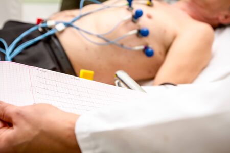 The cardiologist holding and review the electrocardiograph EKG or ECG diagram printed on grid paper.